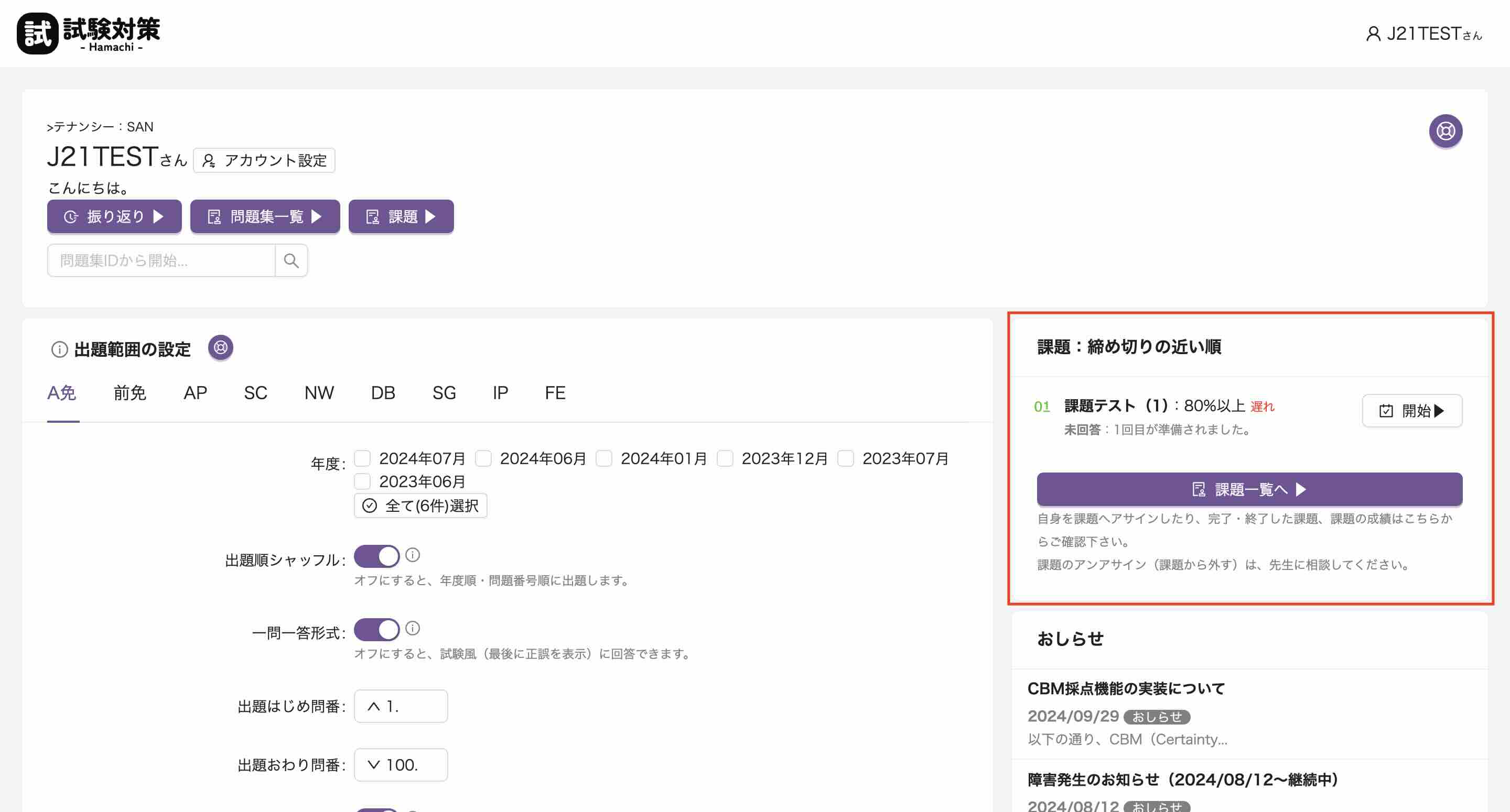 現在課されている課題のうち、回答できるものはTOP画面右側に表示されます。