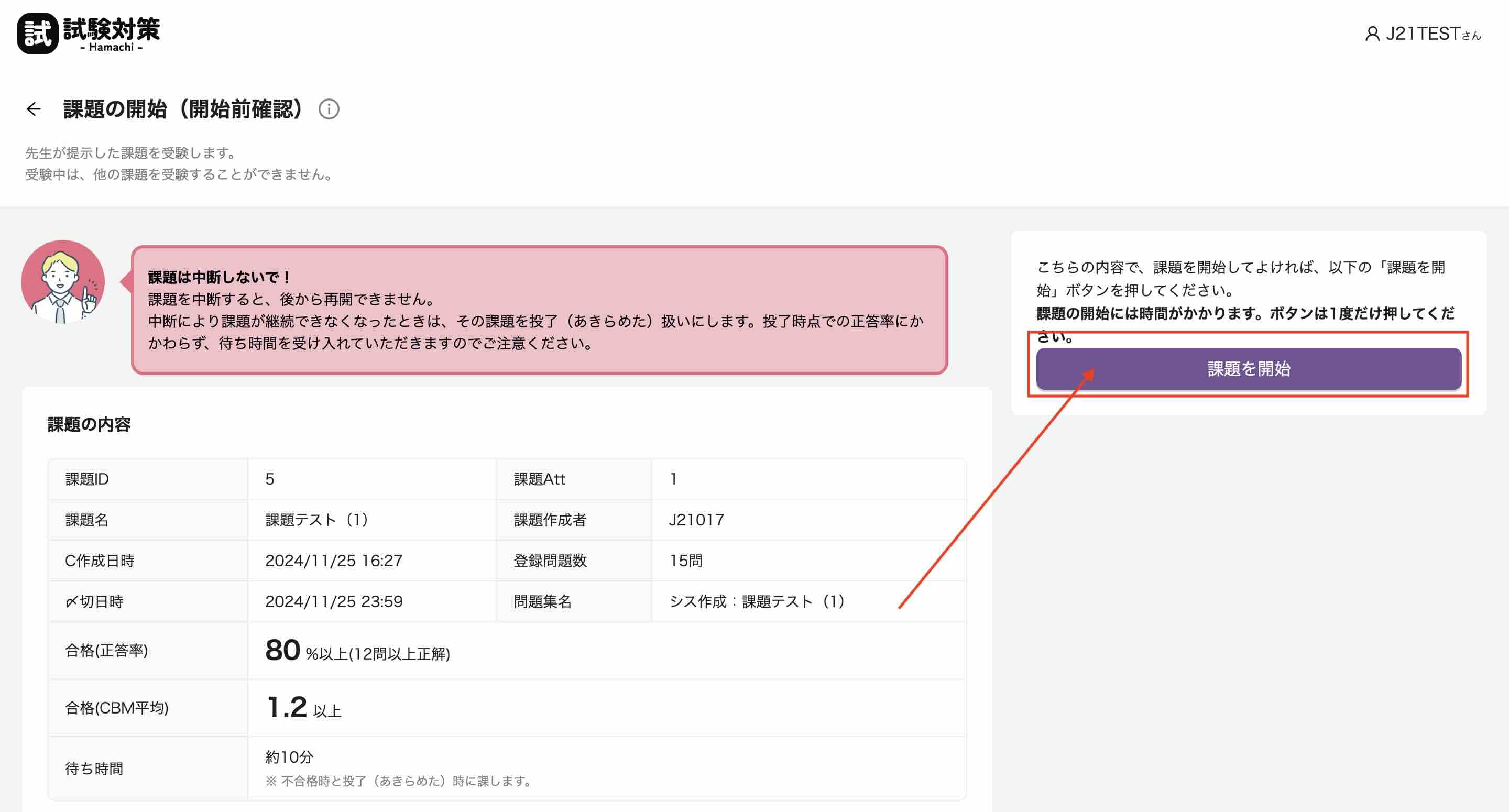 注意事項を確認の上、[課題を開始]ボタンをクリックしてください。