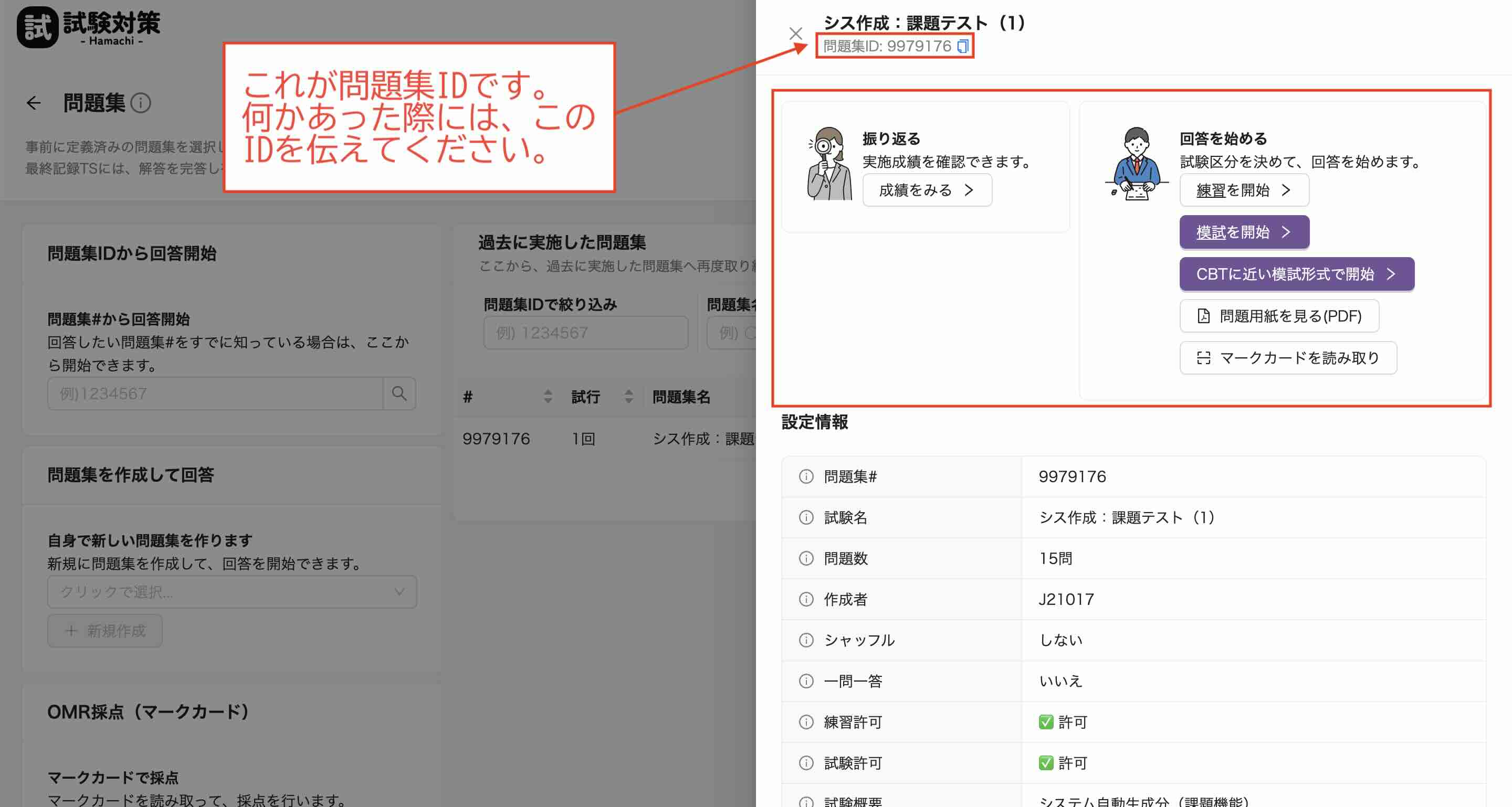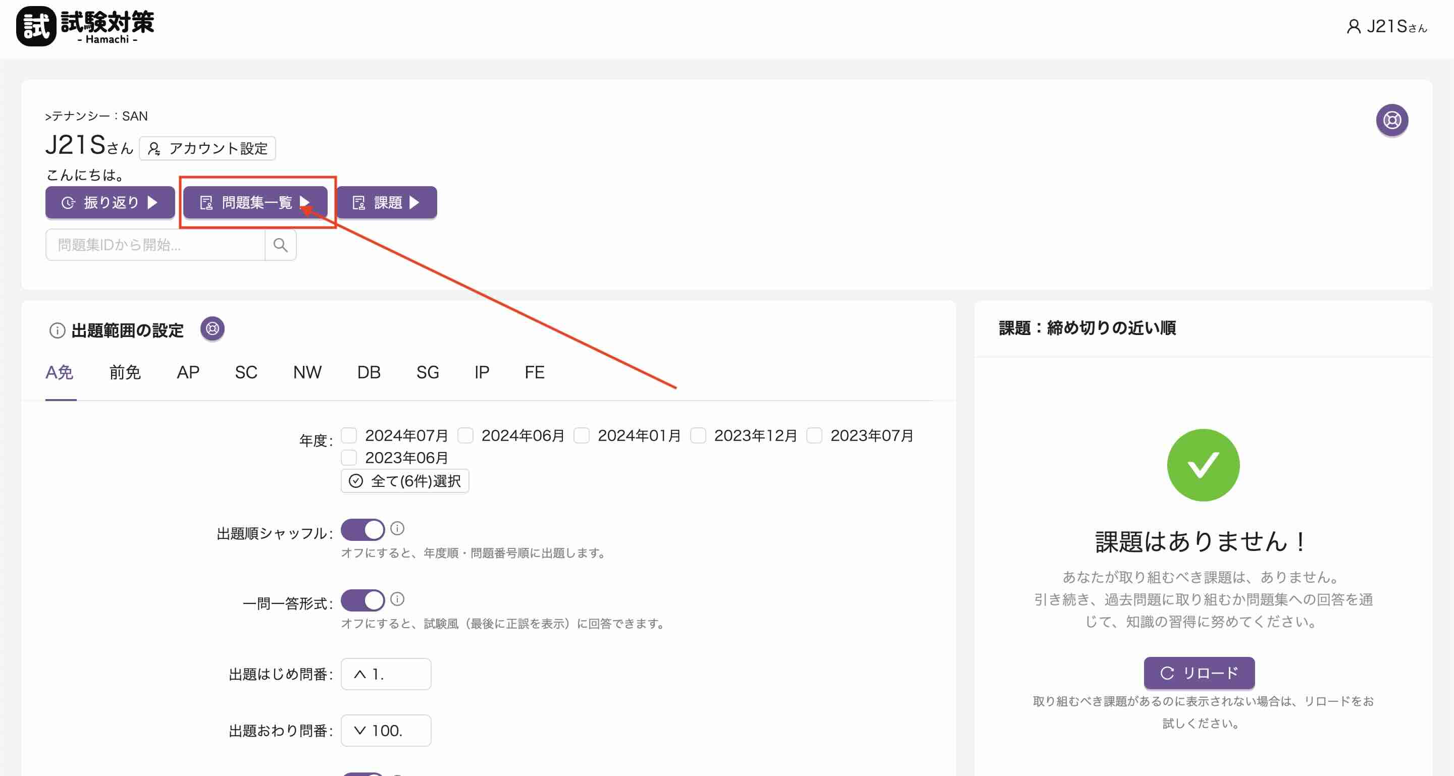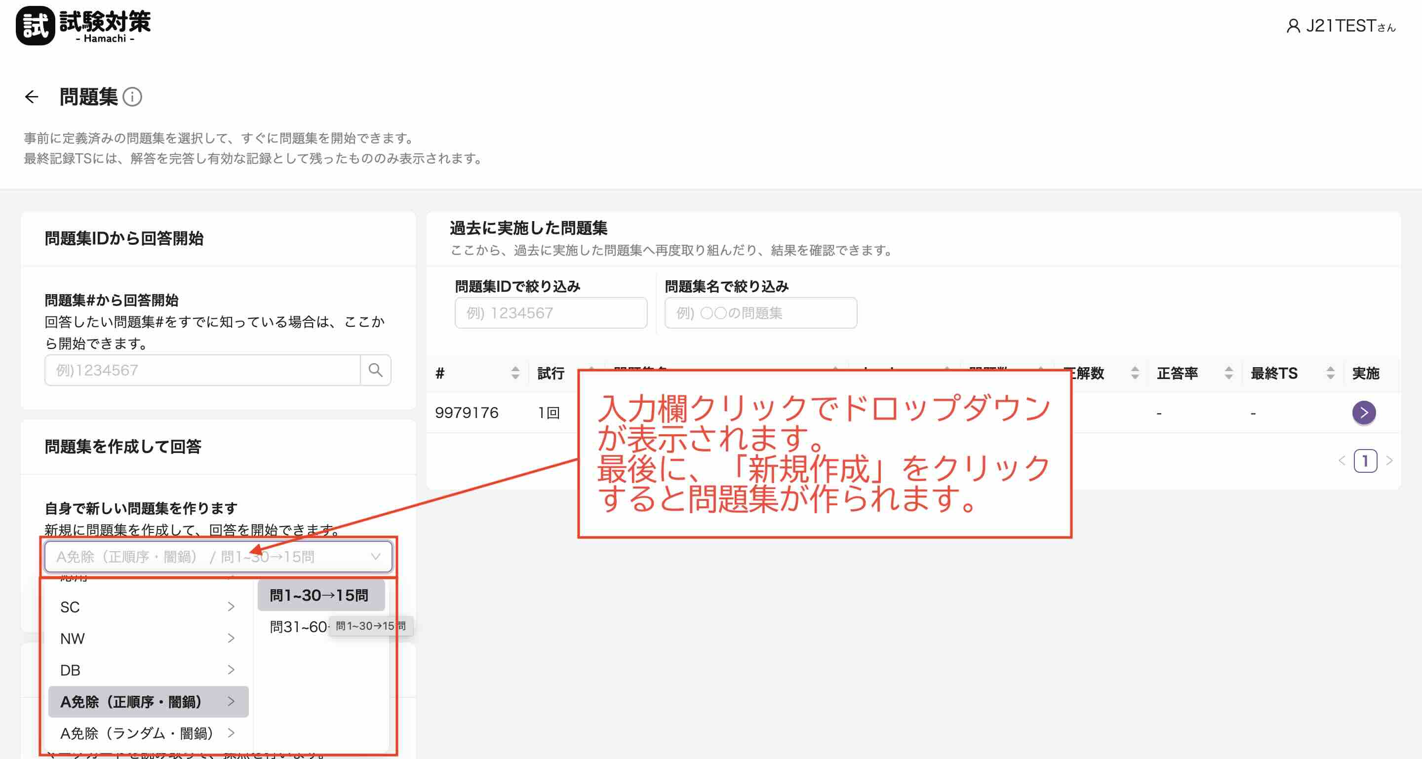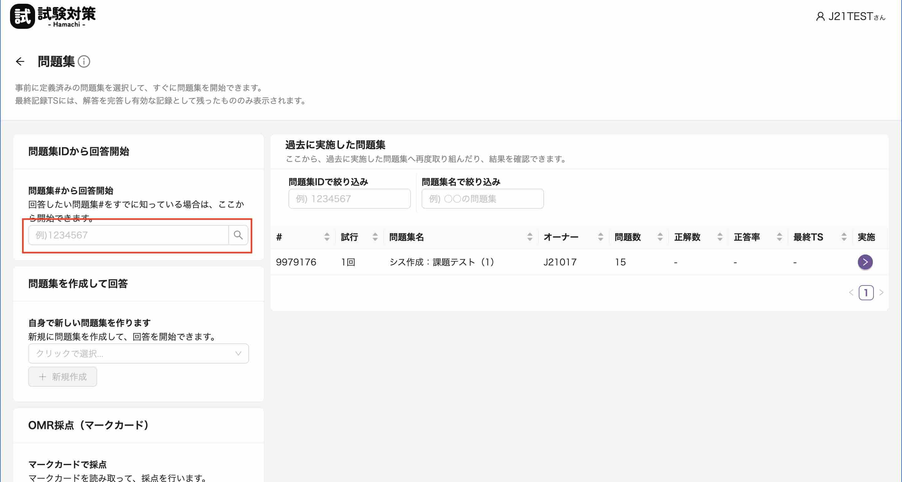 既存の問題集を問題集IDから解答を始めるか、新たに問題集を作成して取り組むか選べます。