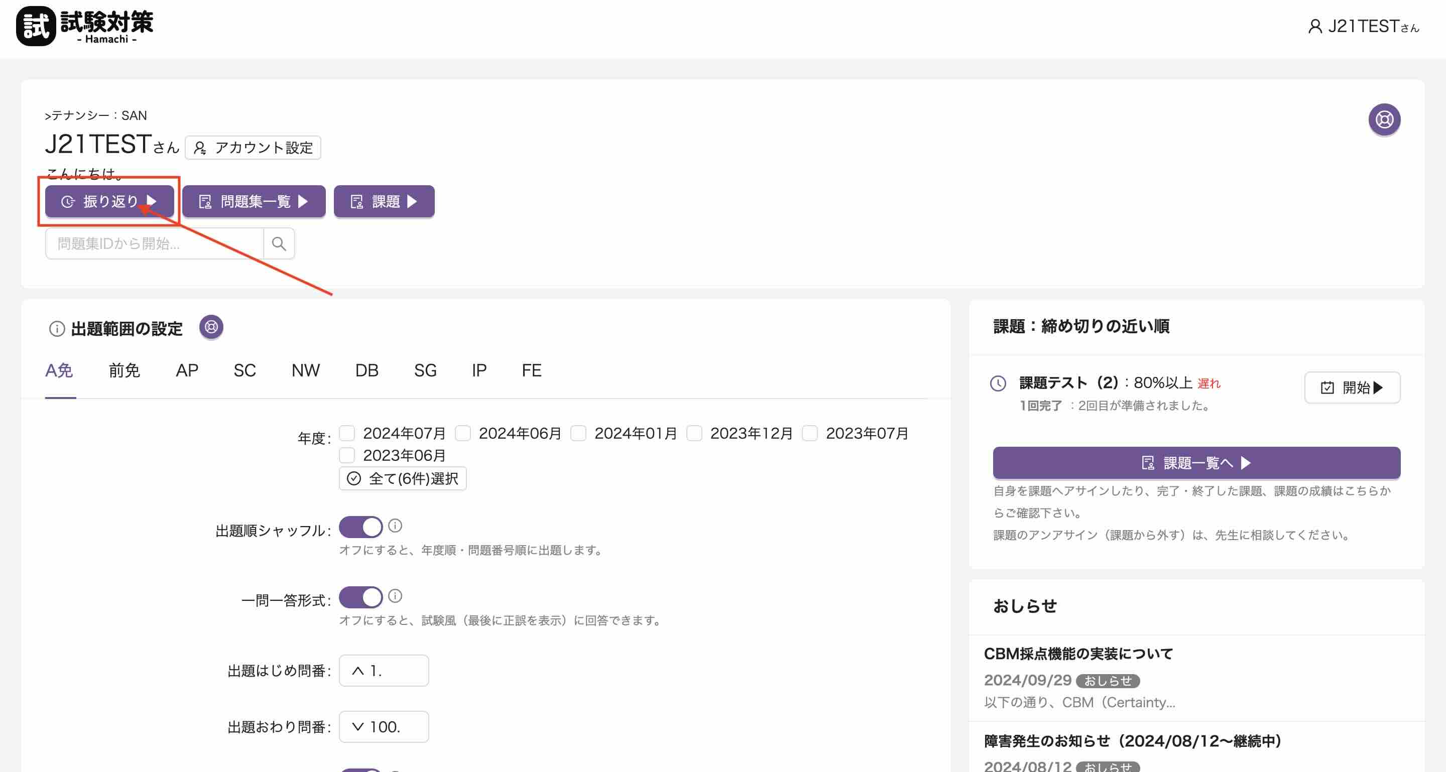 TOP画面の「振り返り」から過去に実施した問題を確認するとともに、自身の学習状況を振り返ることができます。