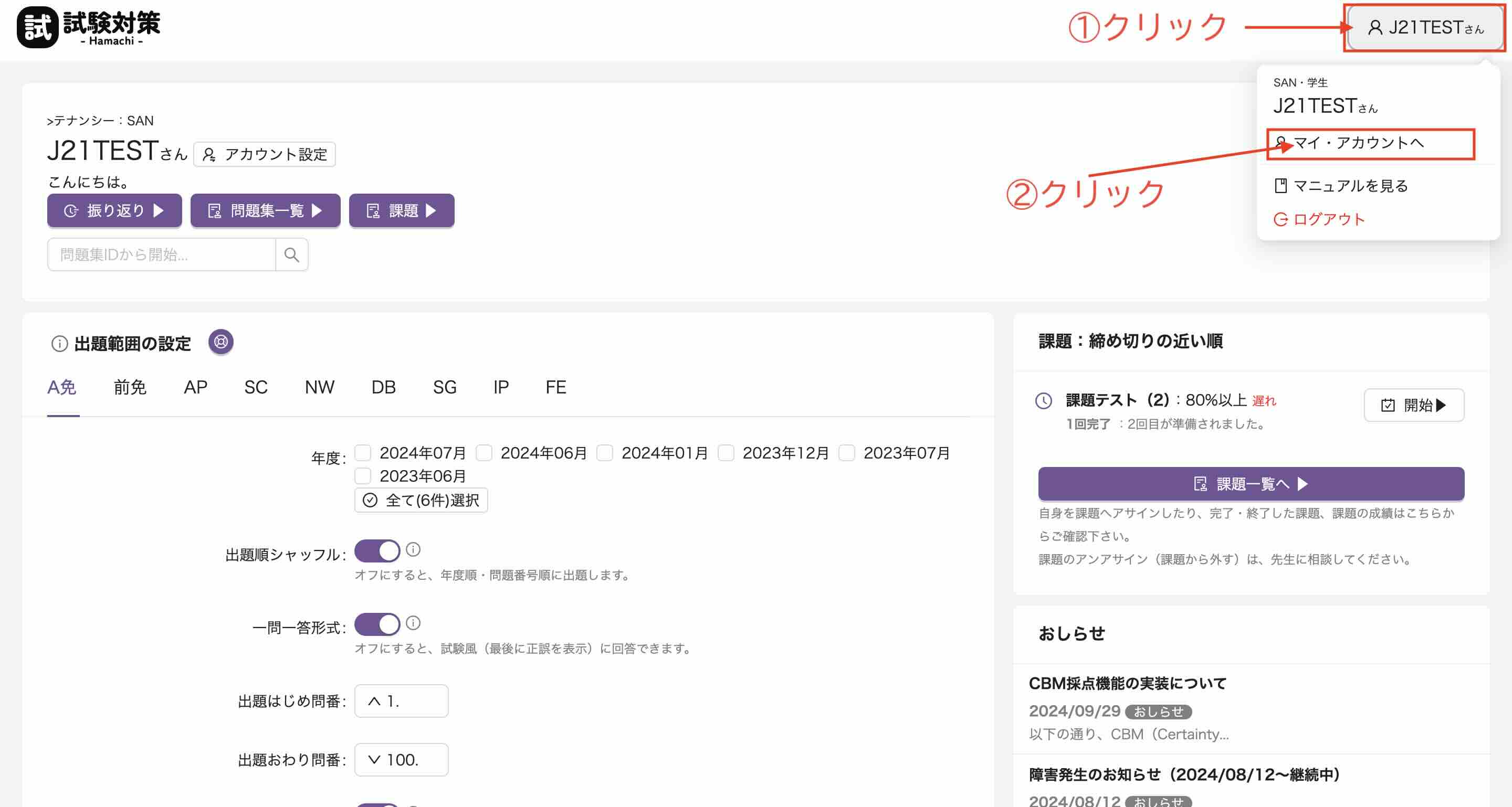 画面左側のメニューから出題設定を編集します。最低限、上部赤枠の試験区分(A免と前免は免除試験のもの、その他の試験区分もあります)と「年度」と「出題はじめ問番」「出題おわり問番」を指定してください。