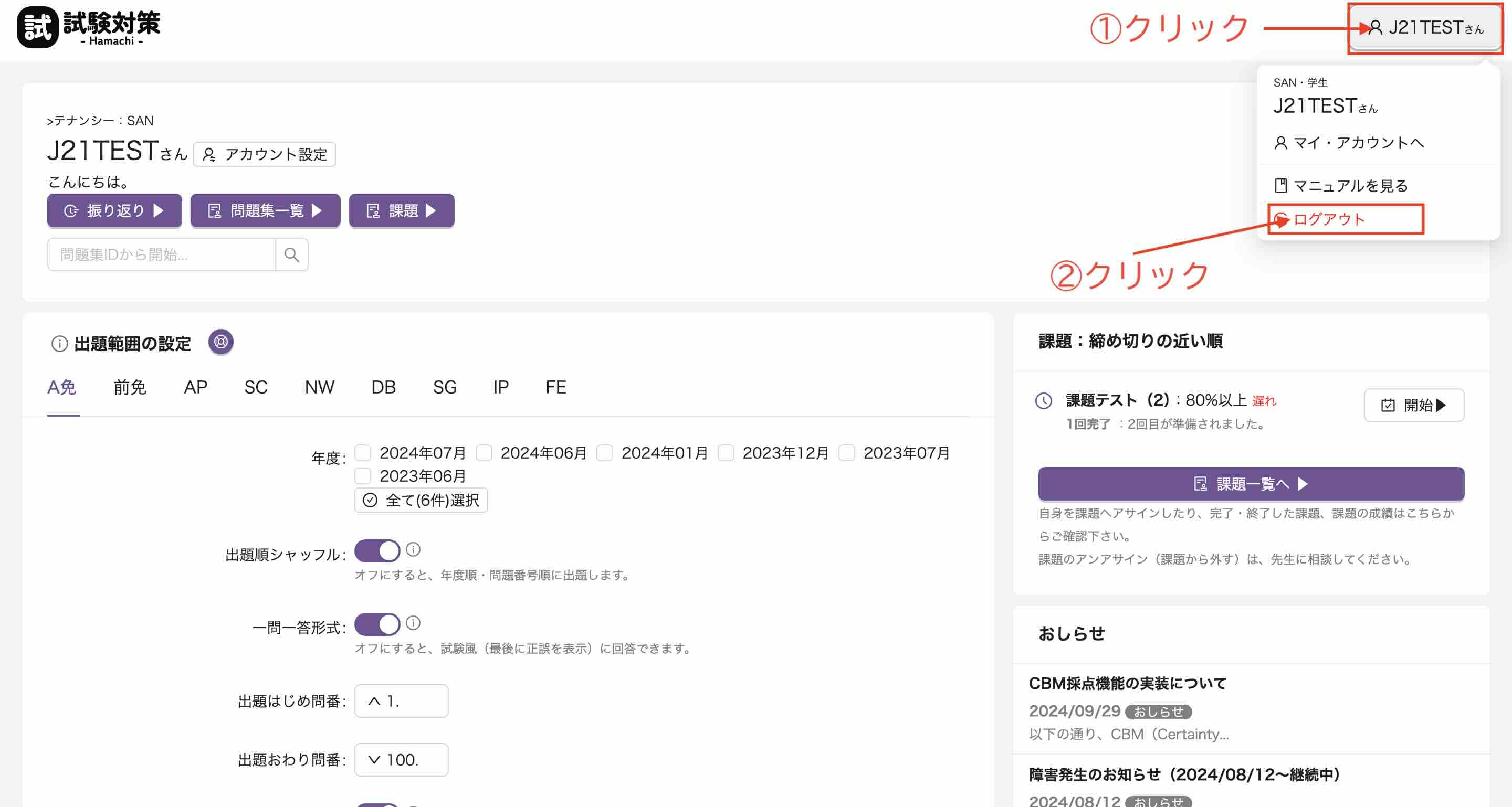 ログアウトするには、画面右上の自身のユーザ名をクリックし、[ログアウト]を選択してください。