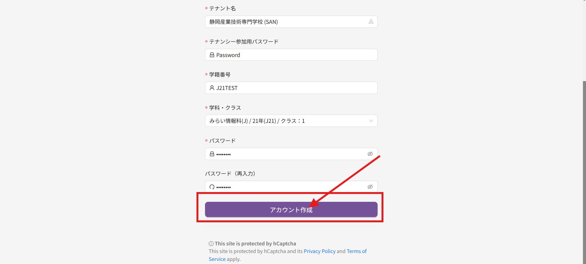 全ての項目を入力し、[アカウント作成]ボタンをクリックすると、アカウントが作成されます。